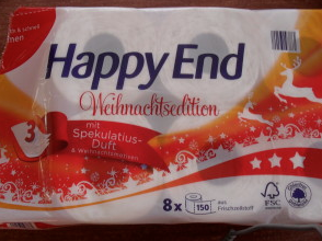 It's covered with happy reindeer on skates. But what I love most about it is the name of the brand: 'Happy End'. I like the pun!