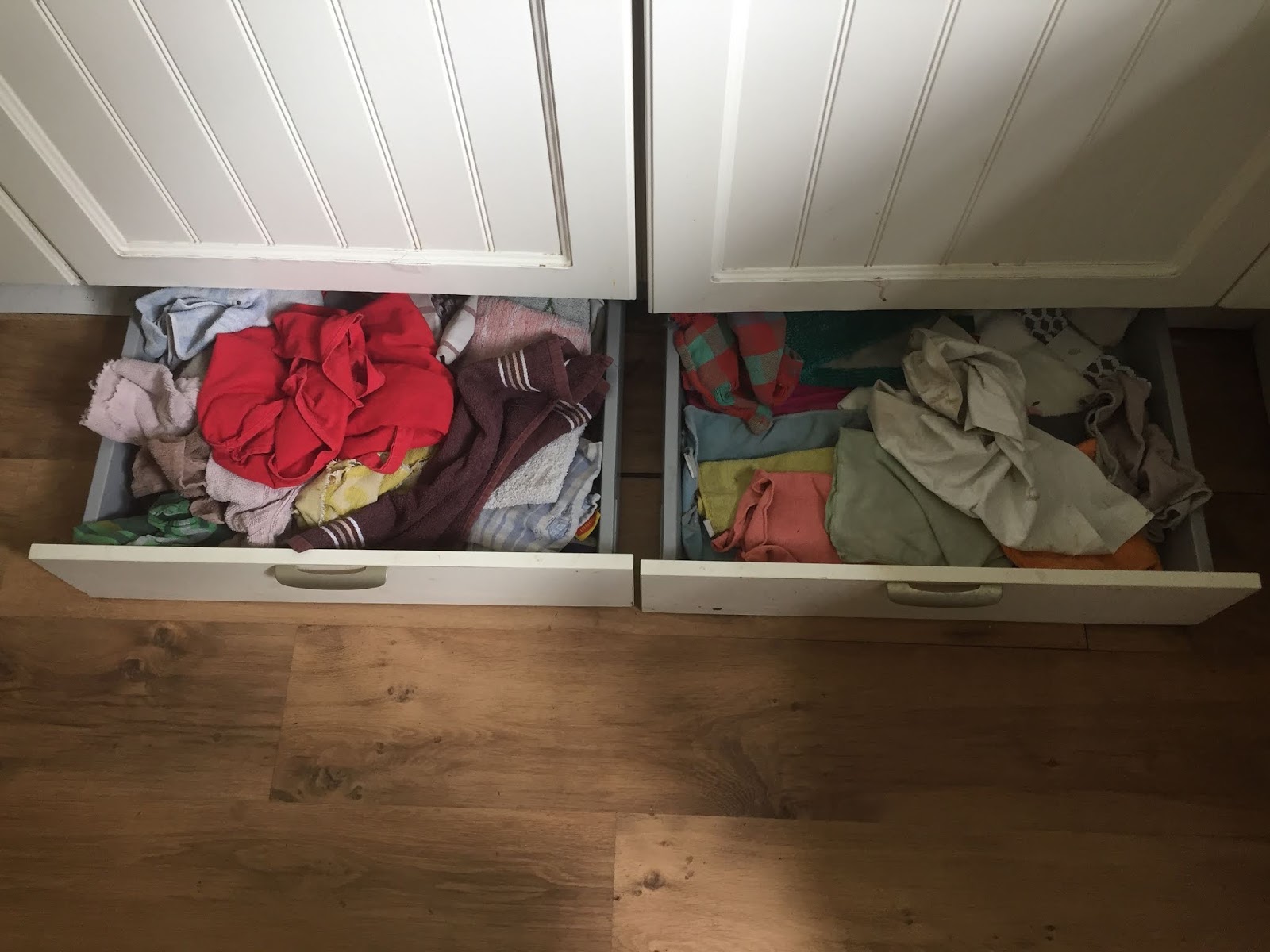 Last week I suddenly felt the urge to 'do something' about my kitchen drawers. In the first picture you can see how they were. And in the picture below you can them after I'd Marie Kondoed them!