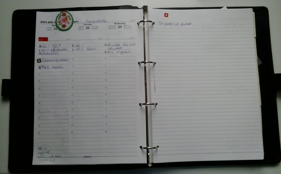 I really like my Moleskine diary. It's almost A4 sized. And it's got the days of the week on the left, and on the right there's note paper! So it's great to keep track of all my appointments ánd I can jot down blogging ideas etc.