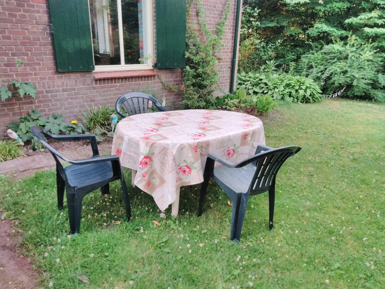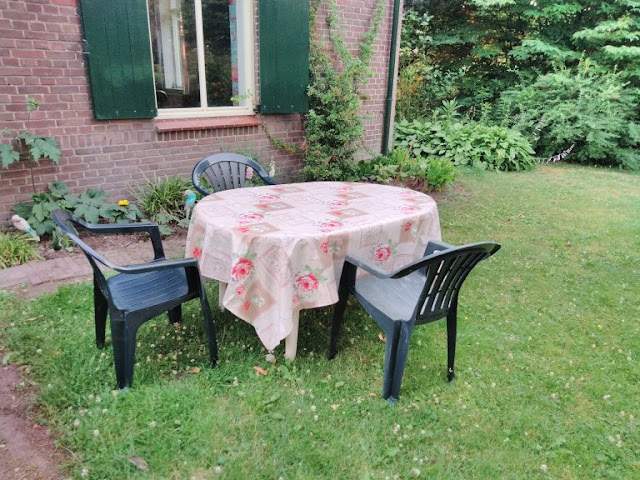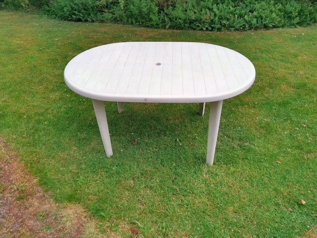 And I found a great garden table for only 7 bucks. It's a bit ugly, but that's nothing that a nice table cloth can't fix!